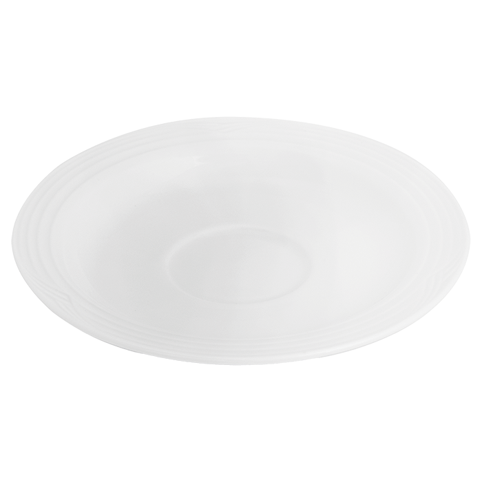 Contemporary design in white with a subtle circular embossed rim on a white fine porcelain body