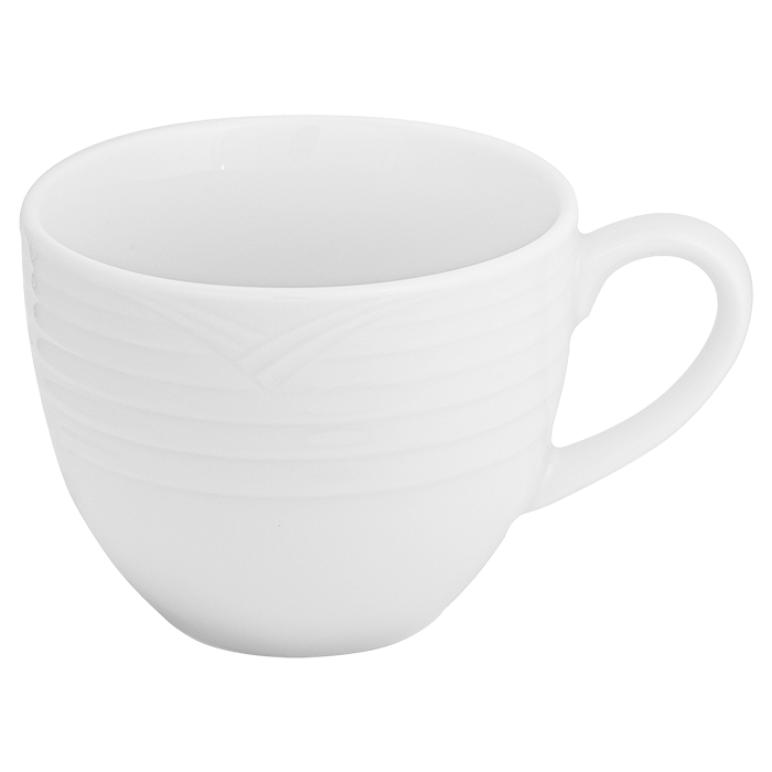Contemporary design in white with a subtle circular embossed rim on a white fine porcelain body